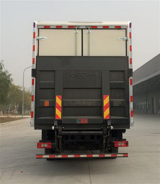 整車備注: 車廂頂部封閉,不可開啟.ABS型號44600XXXX0,廠家威伯科汽車控制系統(中國)有限公司,安裝具有衛星定位功能的行駛記錄儀.選裝同等功率制冷機組,外觀形狀可不同.選裝雙側開門,側開門可取消,選裝液壓尾板,選裝導流罩.側防護的連接方式是與貨箱橫梁螺栓連接,側防護材料為冷板B-2.0;后防護連接方式是與車架縱梁螺栓連接,后下部防護裝置材料為異型管20-D.后部防護裝置截面尺寸100mm×50mm,后防護離地高545mm.