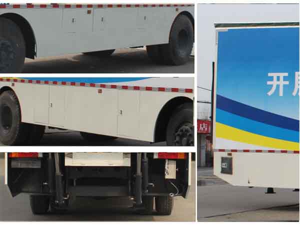 車廂舞臺部分為封閉式頂部封閉。可根據用戶要求選裝導流罩、車輛側面可選裝不帶噴涂及文字,選裝LED屏,選裝后部雙開門的車廂,后部可選裝不帶液壓升降尾板。隨底盤選裝高度不同的駕駛室,高頂駕駛室頂部氣喇叭為選裝件。側防護采用裙板結構,車輛后部為液壓升降圍板,與后防相干涉,故可豁免。 前懸/軸距/后懸對應關系為(mm):1460/1950+5350/3310,1500/1850+5450/3270,該車安裝具有衛星定位功能的行使記錄儀。ABS型號:4460046440,生產廠家:威伯科汽車控制系統(中國)有限公司。