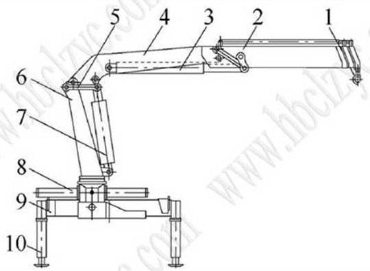 折臂式隨車吊展開狀態(tài)1.吊鉤 2.吊臂總成 3.折疊液壓缸 4.主臂 5.連桿 6.立柱 7.變幅液壓缸 8.回轉(zhuǎn)液壓缸 9.橫梁組 10.支腿機(jī)構(gòu)及控制系統(tǒng)