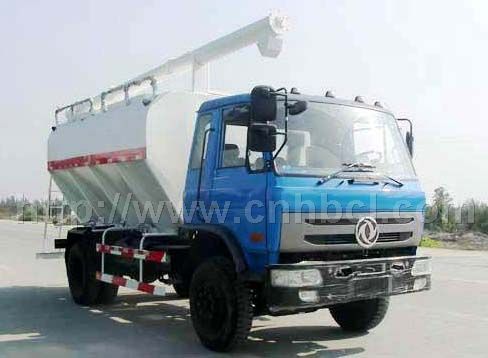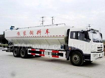 散裝飼料車的飼料罐架設在卡車的底盤上,專用設施由罐體總成、輸送系統(水平卸料系統、垂直卸料系統以及活動卸料系統組成)、散裝飼料車罐,液壓系統(高壓油泵經管路與分配閥連接該閥的三個輸出端分別是轉角液壓馬達、升降油缸以及串聯在一起的水平卸料、垂直卸料、活動卸料液壓馬達)、散裝飼料車罐電動系統、氣動分倉機構等組成。在罐體底部設有閘門,在閘門下面裝有水平螺旋輸送器(俗稱水平攪籠),由取力器由汽車變速箱輸出動力驅動,再傳動高壓油泵以驅動液壓系統,散裝飼料車罐,液壓馬達通過傳動裝置帶動水平螺旋輸送器的葉片軸及葉片旋轉,經活動輸送系統(俗稱活動攪籠)以將飼料輸出。車頂平置的一根活動卸料絞龍可自由回轉和抬升,運輸時頂部的螺旋管平臥在罐頂;卸料時則抬起,散裝飼料車罐使管端的出料口與畜禽飼養場貯料罐頂部的進料門相接、對準,完成卸料。