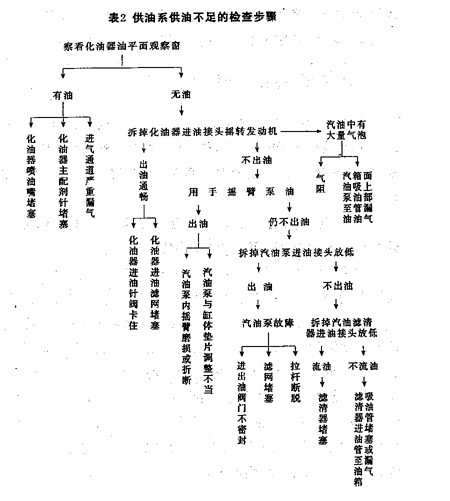 先察看化油器油平面觀察窗,看浮子室是否有油。若有油,為化油器主量孔、出油孔堵塞。有時喉管以下的進氣通道滲入大量空氣,會降低喉管處的真空度,使汽油不能被吸出,也會出現這種情況。若浮子室無油,可能是化油器進油接頭處濾網堵塞。若用扳手在化油器上部輕敲幾下,故障暫時消失,為進油針閥在關閉位置發卡。若放低汽油泵進油管接頭至油箱油面以下,油管流油通暢,故障在汽油泵,可能是進出油閥門不密封、內搖臂嚴重磨損或折斷、濾網堵塞所造成;若不流油,則為汽油泵至油箱間有堵、漏現象。這樣分段查找,故障不難查出。