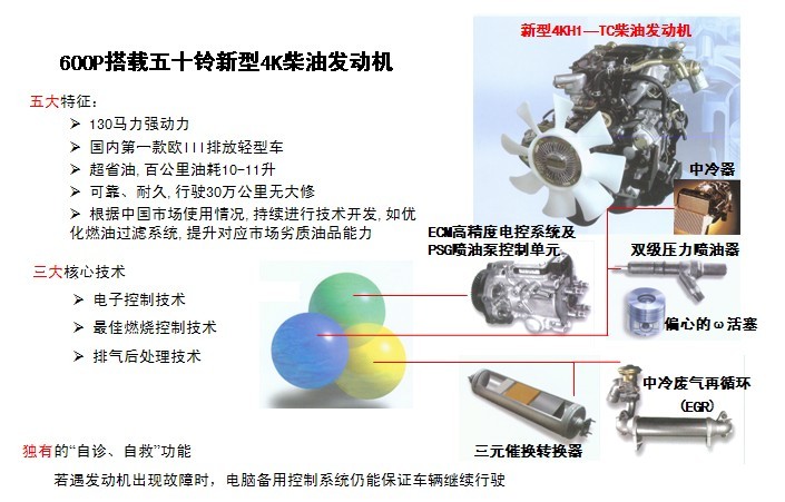 600P采用了五十鈴4KH1發(fā)動機,這款發(fā)動機是五十鈴獨家授權(quán)由慶鈴公司生產(chǎn),而發(fā)動機的電子控制、最佳燃燒控制和排氣后處理都屬于尖端技術(shù),也是別人無法仿制的。此外,600P獨有的V型外觀在推出市場時即向中國專利局申請了專利。600P上市,結(jié)束了中國商用車市場“眾鈴之爭”的局面。