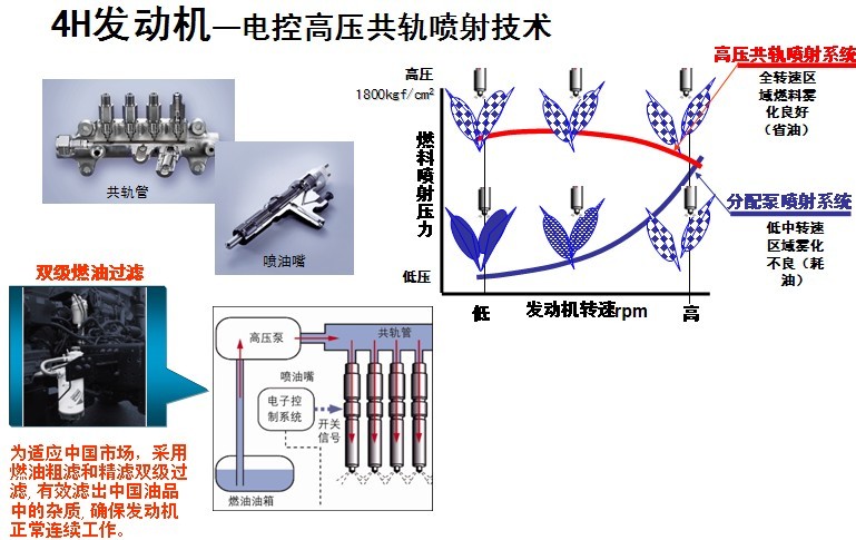 采用高壓共軌、高精度控制燃油電子噴射技術。4H全轉速范圍內高壓噴射,油泵噴射壓力高達2000kgf/cm2, 8孔噴嘴5次噴射,油氣混合好,燃燒充分,出力大。提高燃油霧化,充分燃燒提高燃燒效率,降低燃耗,提高排放水平。