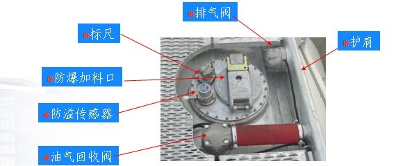 卸料接頭、油氣回收接頭、防溢裝置插座、防靜電接地盤、油品指示器、防駛離系統