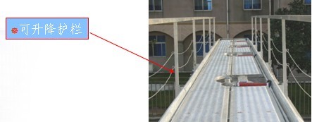 d、罐頂護欄:罐頂兩側安裝有手動或氣控升降的安全護欄,護欄降下后低于護肩,不增加罐車高度,升起后高出罐頂約1m,確保工作人員在罐頂行走時的安全。