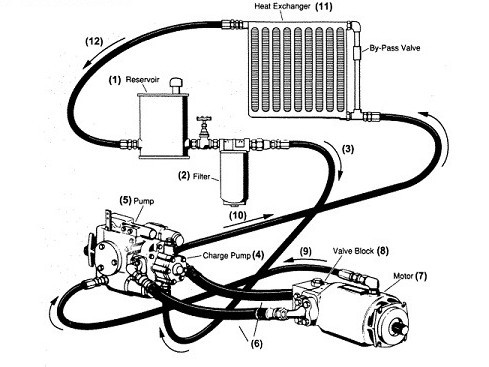 馬達殼體中的油流入泵的殼體中,然后流經(jīng)散熱器,所選的散熱器要保證系統(tǒng)工作最大溫度不超過80℃,并且必須提供旁通閥來避免散熱器中壓力過高。