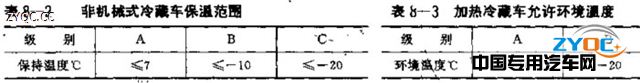 裝有加熱裝置的冷藏汽車,按加熱裝置可使車廂內溫度升至12°C以上,且至少保持12小時的前提下,所允許的環境溫度分為2級,見表8-3.