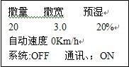 表示當前給料量是每平方米20克,撒布寬度為3米,預濕變頻器轉速為撒量變頻器轉速的20%,車速為每小時0公里
