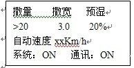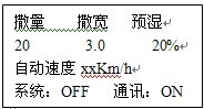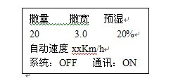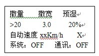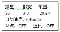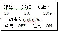 注意:撒布量、撒布寬度、車速三項參數在數據計算中是乘積關聯關系,如果其中一項或幾項過大會導致撒量電機的給料速度超過1600轉/分,在這種情況下,控制儀就會報警,并且撒量電機的給料速度固定為1600轉/分,此時,因將撒量值或撒寬值減小,或者使車速減小,達到撒量電機的轉速小于1600轉/分。