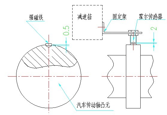 用配送的固定架,將霍爾傳感器固定在距離強磁鐵回轉圓2mm的位置,固定架固定在減速箱上。具體位置根據現場車型而定。
