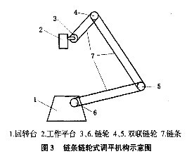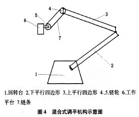 鏈條鏈輪式調平機構比平行四連桿調平機構的 工作角度更大,臂桿之間的工作角度范圍大于 180度,且鏈條、鏈輪可以安裝在臂桿內部,結構緊湊,易于安裝、調整和維護。 根據實際需要,可以用平行四連桿和鏈條鏈輪組成混合式調平機構,布置更加靈活,如圖4所示, 鏈輪4與上平行四邊形3的短邊固聯在一起,在臂 桿的升降過程中,工作平臺始終保持水平。
