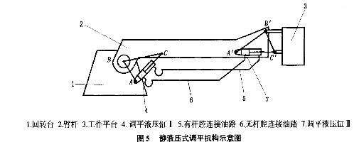 4、靜液壓調平機構 靜液壓調平也稱為液壓伺服液壓缸調平,如圖 5所示,主體部分由兩只結構尺寸完全相同的調平 液壓缸I和調平液壓缸Ⅱ組成。兩根液壓缸的無桿 腔與無桿腔相連,有桿腔與有桿腔相連,能保證一只液壓缸伸長(縮短)一定長度,另一只液壓缸縮短(伸 長)相同的長度。調平液壓缸I連接在回轉臺1與臂 桿2之間,調平液壓缸Ⅱ連接在臂桿2與工作平臺 3之間。當臂桿變幅時,調平液壓缸I長度發生改變,與工作平臺相連的調平液壓缸Ⅱ發生相反方向的長度改變。調平液壓缸I伸長一段距離,/ABC增加;調平液壓缸Ⅱ縮短相同的距離,厶4’B’C’減 少。合理設計AABC和△A’B 7c7的邊長,厶4’B’C7減 少的角度約等于/_ABC增加的角度,從而使工作平 臺保持水平。兩只調平液壓缸組成閉環系統,不受外 部系統的影響,為防止密封和接頭處泄漏影響工作 平臺的調平性能,需在系統中安裝補油裝置。這種調 平機構具有結構簡單、成本低、精度高的特點,適用 于伸縮臂式高空作業車。但存在滯后現象,且滯后現 象隨著高度的增加而更加明顯。