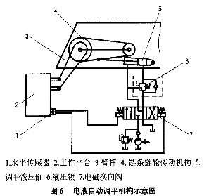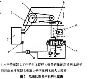 電液調平機構又分為電液自動調平和 電液比例調平。 如圖6所示,電液自動調平機構主要部件包括 水平傳感器1、調平液壓缸5和電磁換向閥7。其中 水平傳感器1安裝在工作平臺2上,當工作平臺處 于水平狀態時,水平傳感器輸出電流為零,當工作平 臺發生傾斜時,水平傳感器產生控制電流,電流的大 小不隨工作平臺的傾斜角度變化而改變。根據工作 平臺傾斜方向的不同,控制電流進入電磁換向閥7 的2個電磁線圈中的1個,使電磁換向閥工作,調平 液壓缸5伸長或縮短,帶動鏈輪鏈條傳動機構4運 動,最終使工作平臺趨于水平。調平是不連續的,適 用于折疊臂式和伸縮臂式高空作業車。 時恢復水平的速度快,工作平臺與水平面之間夾角 小時恢復水平的速度慢,因此其調平過程連續、平穩,調平性能好、控制精度高、動態響應快,適用于各 種形式的大高度的高空作業車。