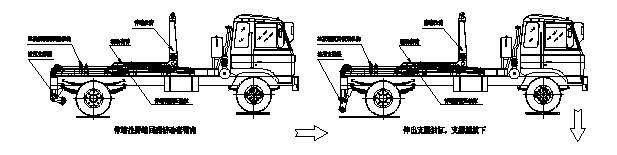 ①將伸縮缸操作手柄推至提點(diǎn)出位置,活動(dòng)套臂內(nèi)的油缸推動(dòng)伸縮拉臂向前平推,從而帶動(dòng)垃圾箱體向前平移,松開(kāi)縮油缸操作手柄;