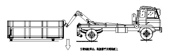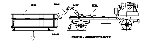 將主臂油缸操作手柄推至伸出位置,主臂油缸伸出,活動(dòng)拉臂旋轉(zhuǎn),帶動(dòng)垃圾箱體慢慢放下車(chē),直至主臂油缸完全伸出回,垃圾箱平放在地面上,松開(kāi)主臂油缸操作手 柄使其回到中位;如圖: