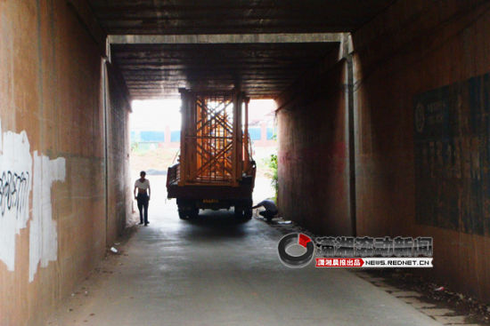 事發的現場位于長沙縣星沙北斗東路(長永職工活動中心)附近的一個涵洞,據司機介紹,橋洞沒有限高標志,橋洞入口洞口較高,而出口有個上坡,造成車輛出不去,所以他們只好將輪胎氣放掉,然后倒退回去,一共花了二三十分鐘。
