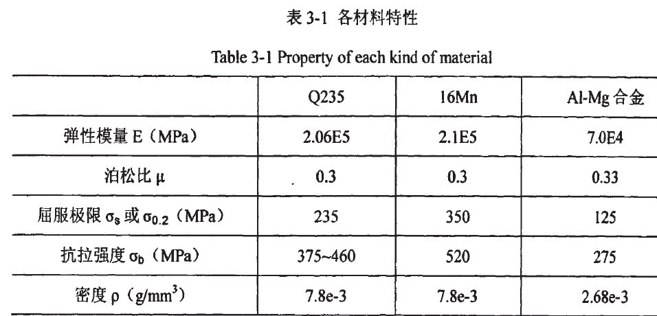 本文中罐體總成主要采用的材料有AI—Mg合金、Q235及16Mn鋼。各材料特性如 表3.1所列表:
