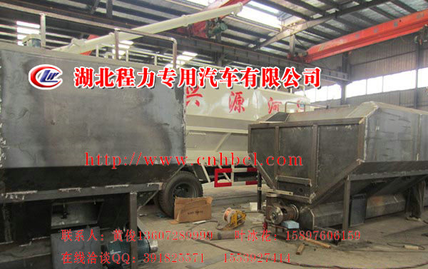 散裝飼料車的飼料罐架設(shè)在卡車的底盤上,專用設(shè)施由罐體總成、輸送系統(tǒng)(水平卸料系統(tǒng)、垂直卸料系統(tǒng)以及活動(dòng)卸料系統(tǒng)組成)、散裝飼料車罐,液壓系統(tǒng)(高壓油泵經(jīng)管路與分配閥連接該閥的三個(gè)輸出端分別是轉(zhuǎn)角液壓馬達(dá)、升降油缸以及串聯(lián)在一起的水平卸料、垂直卸料、活動(dòng)卸料液壓馬達(dá))、散裝飼料車罐電動(dòng)系統(tǒng)、氣動(dòng)分倉機(jī)構(gòu)等組成。在罐體底部設(shè)有閘門,在閘門下面裝有水平螺旋輸送器(俗稱水平攪籠),由取力器由汽車變速箱輸出動(dòng)力驅(qū)動(dòng),再傳動(dòng)高壓油泵以驅(qū)動(dòng)液壓系統(tǒng),散裝飼料車罐,液壓馬達(dá)通過傳動(dòng)裝置帶動(dòng)水平螺旋輸送器的葉片軸及葉片旋轉(zhuǎn),經(jīng)活動(dòng)輸送系統(tǒng)(俗稱活動(dòng)攪籠)以將飼料輸出。車頂平置的一根活動(dòng)卸料絞龍可自由回轉(zhuǎn)和抬升,運(yùn)輸時(shí)頂部的螺旋管平臥在罐頂;卸料時(shí)則抬起,散裝飼料車罐使管端的出料口與畜禽飼養(yǎng)場貯料罐頂部的進(jìn)料門相接、對準(zhǔn),完成卸料。湖北程力專用汽車有限公司新研發(fā)、生產(chǎn)的散裝飼料車,又名散裝飼料運(yùn)輸車。結(jié)構(gòu)簡單、性能可靠、輸送量大、操控方便、機(jī)動(dòng)性強(qiáng)、對物料無污染等特點(diǎn),廣泛應(yīng)用于各大中小型養(yǎng)殖企業(yè)的飼料的運(yùn)輸。公司從開發(fā)設(shè)計(jì)、生產(chǎn)加工、出廠檢驗(yàn)、安裝調(diào)試、售后服務(wù)都有一套科學(xué)嚴(yán)密的管理程序。