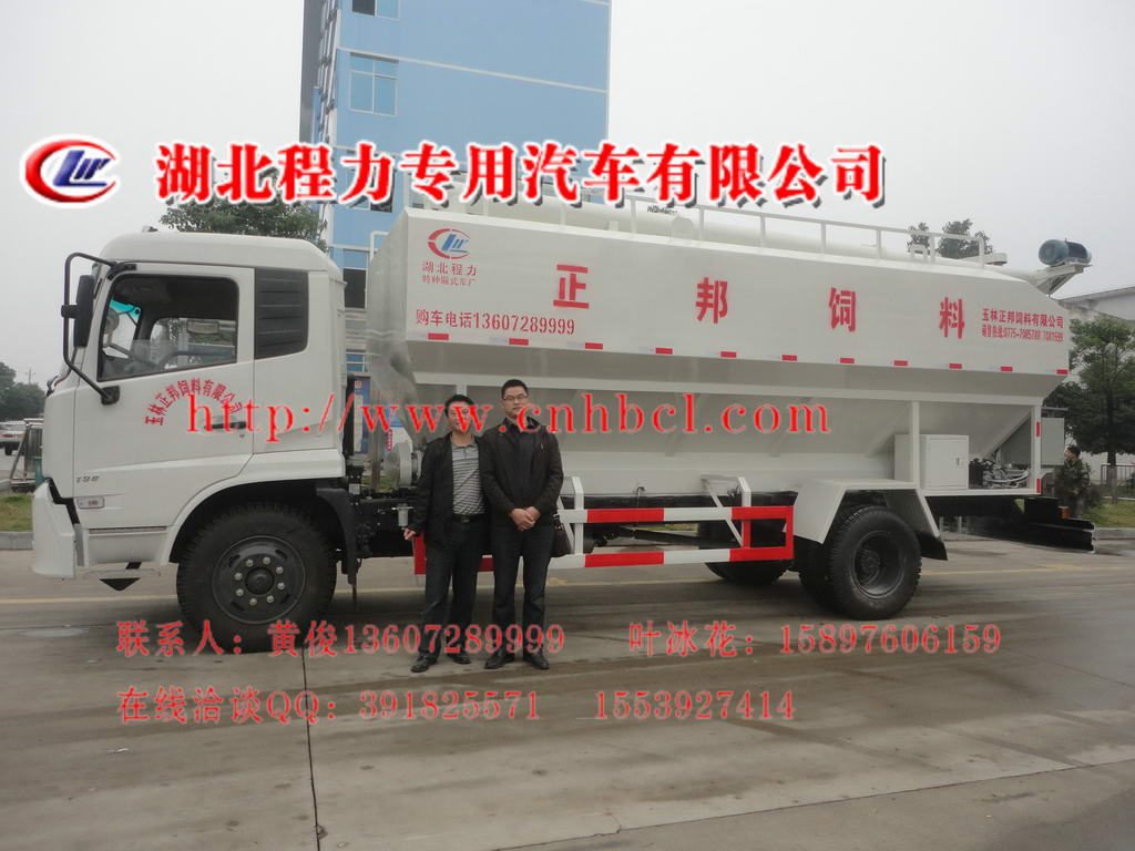 散裝飼料車的飼料罐架設在卡車的底盤上,專用設施由罐體總成、輸送系統(水平卸料系統、垂直卸料系統以及活動卸料系統組成)、液壓系統(高壓油泵經管路與分配閥連接該閥的三個輸出端分別是轉角液壓馬達、升降油缸以及串聯在一起的水平卸料、垂直卸料、活動卸料液壓馬達)、電動系統、氣動分倉機構等組成。在罐體底部設有閘門,在閘門下面裝有水平螺旋輸送器(俗稱水平攪籠),由取力器由汽車變速箱輸出動力驅動,再傳動高壓油泵以驅動液壓系統,液壓馬達通過傳動裝置帶動水平螺旋輸送器的葉片軸及葉片旋轉,經活動輸送系統(俗稱活動攪籠)以將飼料輸出。車頂平置的一根活動卸料絞龍可自由回轉和抬升,運輸時頂部的螺旋管平臥在罐頂;卸料時則抬起,使管端的出料口與畜禽飼養場貯料罐頂部的進料門相接、對準,完成卸料。