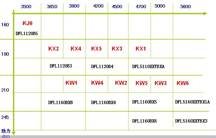 2-1、替代EQ1092F的底盤:DFL1120B9-KJ5(3500軸距、160馬力)、DFL1120B11-KJ7(3800軸距、160馬力)