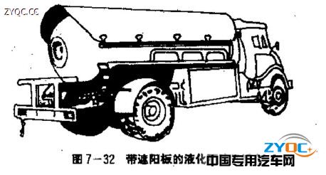 對于裝運低溫物質或有特殊要求的液化氣罐,還必須采取隔熱保溫措施,防止因超溫、超壓而發生事故。常采用以下三種措施:一是隔熱層,在罐體表層敷設隔熱保溫材料(如泡沫塑料、玻璃棉、巖棉、聚氨酯等),在其外殼上又包有蒙皮。這種隔熱保溫方式用途廣泛,價格較低,質量也較輕,常用于裝運液化乙烯、液化二氧化碳罐車等;二是真空夾套,如圖7-31b所示,在液化氣罐的外面再加一層罐體,兩層罐體之間填充干燥劑和保溫材料,并抽成真空。它具有良好的隔熱效果,是裝運液氧、液氬等低溫介質的理想罐體;三是遮陽板,如圖7-32所示。它是在罐體的頂部裝設防止陽光暴曬的遮陽板,遮陽板與罐體相隔一定距離,形成前后相同的夾層。罐車行駛時,利用流動氣流散熱。遮陽板采用反光較強的白色,以降低吸熱量。這種結構多用于液化石油氣罐車。