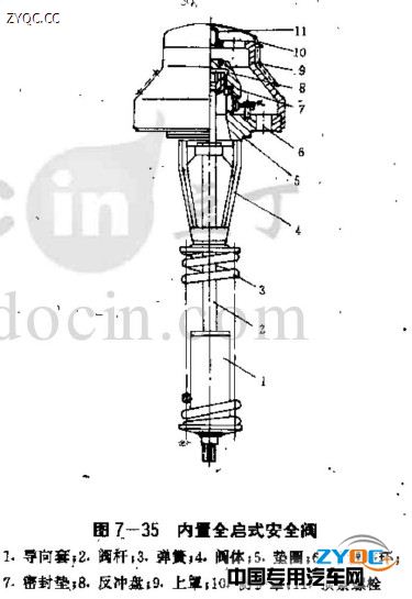 液化石油氣罐車采用內置全啟式安全閥,如圖7-35所示。該閥屬于單反沖盤結構,彈簧3部分裝在罐體內,降低了安全閥外漏部分的高度,對降低車輛高度和安全閥自身安全是有利的。反沖盤8裝在閥桿2的頂端,彈簧3裝在閥體4的下方,閥桿下端與彈簧之間裝有導向套1.它對彈簧起導向定位作用,彈簧下端通過彈簧座由螺母鎖緊在閥桿2上,通過調整該螺母來調整彈簧3的預緊力,以調整安全閥的開啟壓力。彈簧3表面進行鍍鉻防腐處理,以延長其使用壽命。