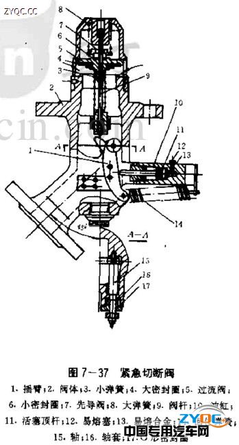 圖7-37為液化石油氣罐車上使用的緊急切斷閥。它裝在罐車的裝卸管路與罐體的連接處。通常,緊急切斷閥是處于關閉狀態,當罐車裝卸作業時,通過手油泵將壓力油壓入油缸10,推動活塞頂桿11左移,克服彈簧14的張力,使搖臂1的下端向左擺動,帶動軸15及其凸輪、推動閥桿9上移,使過流閥5離開閥體2而打開緊急切斷閥;當罐車裝卸完畢或管路系統發生泄露,需緊急切斷液、氣通道時,可通過液壓控制系統,使油缸10卸壓,在回位彈簧14的作用下,搖臂1逆時針擺動,過流閥5在大、小彈簧8和3的作用下回位,緊急切斷關閉;當液化氣體大量泄漏而釀成火災時,易熔合金13在高溫下融化,使液壓控制系統卸壓,達到自行切斷液化氣體沿管路系統外泄通路的目的。