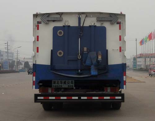 洗掃車采用中置兩刷盤,中置寬吸盤,配上具有防撞避障功能的V型高壓沖水架,組成一條大于3.5米的沖洗清掃帶。采用康明斯EQ6BT5.9-118型副發動機作為動力的驅動裝置橫置在車架中部,具有氣動離合裝置控制的抽吸風機布置在動力倉的左側。采用不銹鋼材料加工而成的水箱與垃圾箱均為采用方形瓦棱結構。水箱分為兩部位,一部分為前置獨立水箱,裝配在動力倉的前部;另一部分為設置在垃圾箱前部的水箱,可隨垃圾箱與動力倉罩同時升降。具有舉升功能的垃圾箱內裝配有高壓沖洗噴頭,使得卸料更為輕松、干凈徹底。能夠隨垃圾箱體舉升的動力倉罩可使動力系統的維修保養極為便利。采用歐美地區的名優配套部件,使得整車性能更為優良,工作更為可靠。