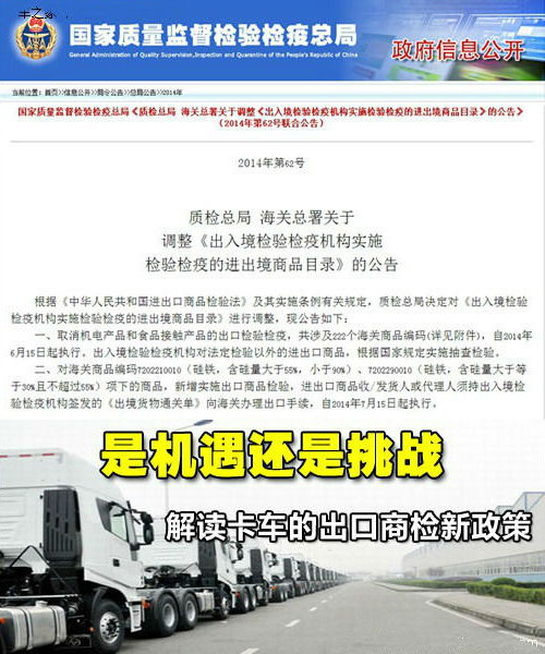 看看是機遇還是挑戰(zhàn),解讀卡車出口的商檢新政,國家質(zhì)檢總局與海關(guān)總署于6月9日聯(lián)合下發(fā)公告,決定對《出入境檢驗檢疫機構(gòu)實施檢驗檢疫的進出境商品目錄》進行調(diào)整,卡車之家為大家?guī)肀敬喂娴囊恍┱呓庾x。