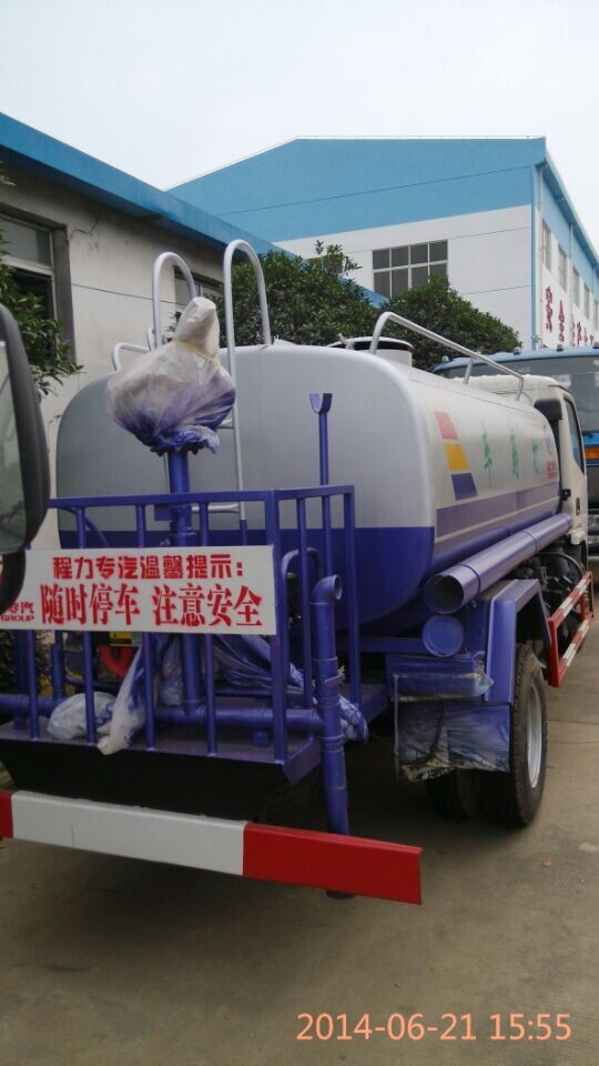 程力灑水車功能介紹:采用武鋼國標5mm碳鋼板制作,兩側封頭采用5mm武鋼熱軋板制作,內置防蕩板3個,以避免在滿載狀態下因液態沖撞而造成剎車效果不佳、轉向不靈等情況的發生。為了提高使用壽命,對罐體和水管進行了磷化防腐處理,罐體內壁涂有無毒防銹漆。