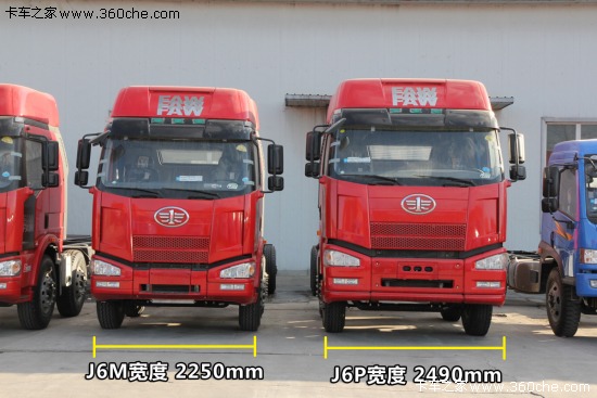 解放J6P與J6M放在一起很好區別,J6M一眼看去就是小一號的J6P。具體尺寸上J6P駕駛室寬度為2490mm,高度上牽引車相對自卸車和載貨車略低,牽引車高度為:3060mm(平頂)、3560mm(高頂)、3980mm(高頂導流罩)、3800(新高頂);J6P自卸車與載貨車底盤稍高,平頂駕駛室高度為3100mm,高頂駕駛室高度為3590mm。