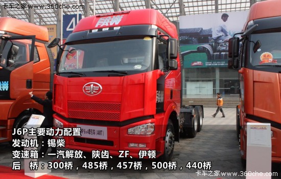 J6P動力搭配上比較豐富,主要搭載錫柴CA6DM2、CA6DN1、CA6DL2、CA6DL1系列發動機,最小240馬力,最大500馬力,變速箱有一汽解放(9檔、10檔、12檔)、ZF(16檔)、陜齒(12檔)、伊頓(13檔)等品牌可供選擇,后橋匹配16噸輪邊減速300橋,13噸單級減速485橋,13噸單級減速457橋,13噸單級減速500橋,單級減速440橋。