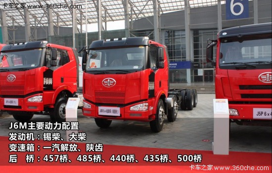 相對J6P,J6M動力搭配較少,主要搭載錫柴CA6DL1與大柴BF6M1013系列發動機,最小220馬力,最大310馬力,變速箱有一汽解放(10檔)、陜齒(9檔、8檔)品牌可供選擇,后橋匹配13噸單級減速457橋、單級減速485橋、單級減速440橋、輕量化435橋、選裝500橋。