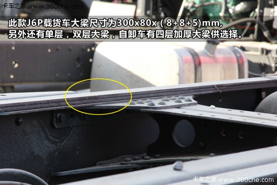 J6P大梁比J6M厚1mm,J6P大梁厚度為8mm,J6M為7mm。具體大梁尺寸(斷面高X翼面寬X板料厚),上圖J6P載貨車大梁尺寸為300X80X8+8+5mm,另外還有單層,雙層大梁,自卸車還有四層大梁的車型,大大提高車輛的承載力,適應重載需求。