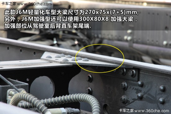 此款J6M輕量化車型大梁尺寸為270x75x(7+5)mm,另外,J6M加強型還可以使用300X80X8 加強大梁,加強部位從駕駛室后背直車架尾端。