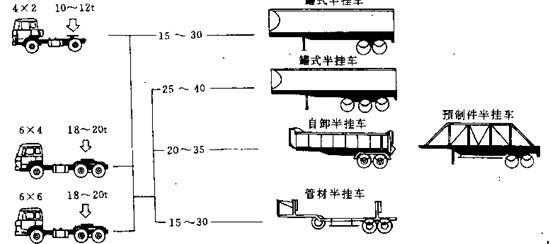 (3)針對專用汽車品種多,批量少的生產特點,專用汽車設計應考慮產品的系列化,以便根據不同用戶的需要而能很快的進行產品型圖1-1為某廠牽此車,半掛車和全掛車系列型譜。對專用汽車零部件的設計,應按“三化”的要求進行,最大限底地選 用標準件,或選用已經定型產品的零部件,盡量減少自制件。