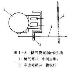 儲氣筒的布置必須便于檢查和排水,在某些廂式專用汽車上,儲氣筒排水開關上需要多裝一個控制操縱開關,如圖1-8所示,操縱桿盡可能安裝成水平位置,以利于排水開關的操作。當排水開關至車身裙部之間距離大于300mm時,應設中間支承。