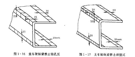 c、在縱梁的邊,角區(qū)域亦禁止鉆孔或焊接,如圖1-16,圖1-17所示的區(qū)域即為不允許鉆孔和焊接加工的部位。因?yàn)樵谶@些部位進(jìn)行鉆孔或焊接,極易引起車架早期開裂。