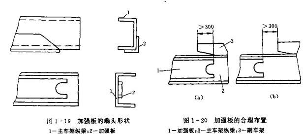 加強(qiáng)板布置的合理,可以有效地減少車架的應(yīng)力,若布置不合理,則可能使車架產(chǎn)生應(yīng)力集中,為了避免應(yīng)力集中,加強(qiáng)板的 端頭位置不應(yīng)在剛度變化部位和集中載荷作用地方。例如,應(yīng)使加強(qiáng)板的 端頭和副車架的端頭充分重疊一部公或使二者相互離開足夠的距離,如圖1-20所示。