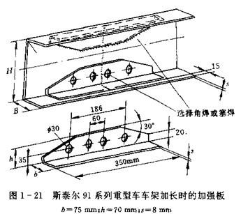 圖1-21為斯泰爾91系列重型車車架末端加長(zhǎng)超過200mm時(shí),所用的兩塊加強(qiáng)板的結(jié)構(gòu)和盡寸。加強(qiáng)板和主車架縱梁腹板的固定采用圓孔塞焊和角焊,但只能焊接在主車架縱梁的腹板上。加強(qiáng)板兩端頭以及距兩端頭10mm的區(qū)間內(nèi)嚴(yán)禁焊接。
