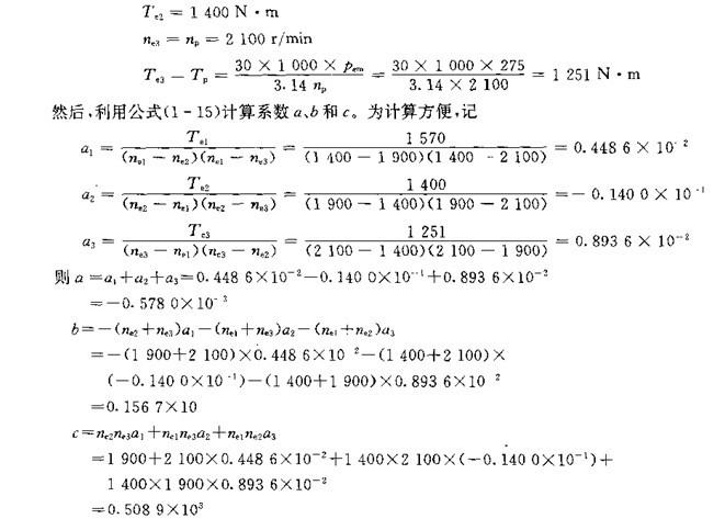 1、已知外特性曲線時,根據外特性數值建立外特性方程式,如果已知發動機的外特性,則可利用拉格朗日三點插值法求出公式(1-13)中的三個待定系數a 、b、 c、。在外特性曲線上取三個點即,依拉氏插值三項式有: