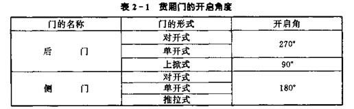 側門寬度一般在1200-2000mm內選取。根據我國交通法規,側門一律在車廂右側。側門中心線與車廂前端的距離應為車廂總長的1/2左右。車廂門的開啟角度見表2-1所示、