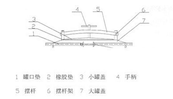 6、罐體組件(附圖二):罐口為直徑Φ410mm的孔,以供維修保養(yǎng)進出罐體之用。大蓋由卡箍及螺栓緊固在罐口頸上,小蓋板由一個支銷和一個耳板將其與大蓋板連接在一起,順時針轉(zhuǎn)動小蓋上手柄,可使小蓋板壓緊。反轉(zhuǎn),脫開耳板后,小蓋板可打開用于加水。