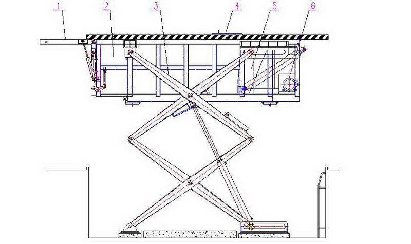 1.箱門 2.箱體 3.起升架 4.投料口 5.推板機構 6.電動機