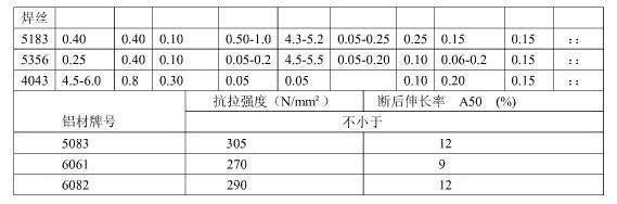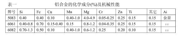 9、鋁合金母材和焊絲的化學成分及機械性能見表一