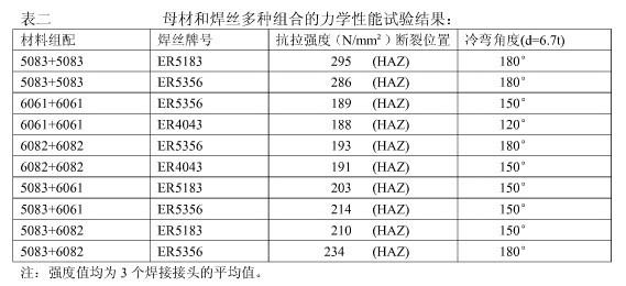 10、鋁合金母材和焊絲多種組合的焊接接頭力學性能見表二。