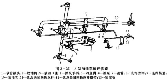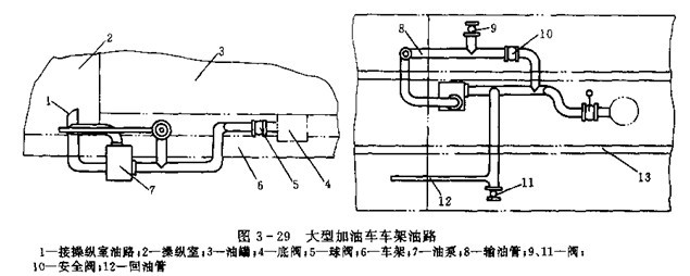 ①車架油路的布置。車架油路布置通常隨油泵位置而定。油泵位置應盡量靠近動力源,縮短傳動距離,但要保證加油車的通過性能。油路一般沿車架平面布置,力求管路短,變曲少。圖3-29為一輛大型加油車的車架油路布置圖,由于油泵7是油汽車發動機驅動,所以油泵在汽車車架內側,靠近前部。油路按車架下平面布置。