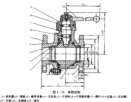 放油閥常用的有球閥、蝶閥等。目前各類加油車大多用鋁合金球閥,通徑¢25mm的球閥保留了原閘板閥的外部連接尺寸,通徑¢50mm、¢65mm、¢80mm、¢100mm四種規格的球閥主要尺寸列于表3-2,結構如圖3-26所示。這樣,與管道的連接法蘭尺寸都可實現標準化,軟管接頭和接頭閥亦采用國際通用的通徑¢63.5mm(¢2.5in).