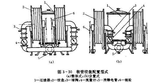 操縱室油路的布置主要決定于操縱室的大小及兩絞盤的配置型式。兩絞盤的配置型式有整體式和分置式兩種,圖3-30(a)是責人絞盤集中配置的整體式配置型式,流量計,閥門等布置在絞盤兩側,來自車架油路的油液經過濾器,消靜電管后由中間向外側分左右兩路進入絞盤軟管,這種布置的優點是絞盤結構簡單,緊湊,但流量計和閥門在兩側,不便于觀察和操縱。圖3-30(b)是兩絞盤分開配置的分置式配置型式,油液經過濾器,消靜電管后分兩路自兩絞盤內側進入絞盤軟管。這咱布置優點是流量計和閥門集中在絞盤之間,便于觀察和操縱。
