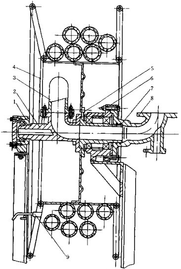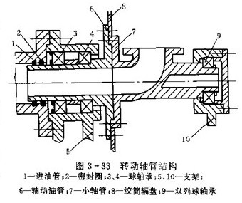 (3)轉動軸管設計,轉動軸管是轉動油管與小軸管(見圖3-31)的合稱,為絞盤總成的重要部件。在轉動軸管結構設計時,即要考慮管路密封,不寧考慮其支承絞盤,起到轉動軸的作用。圖3-33為轉動軸管的結構,由轉動油管6和小軸管7組成,中間用法蘭聯接。軸管的一端伸入進油管1( 固定管)兩者以有相對轉動,用密封圈密封,另一端支承在支架上。這種設計,與整體結構(中間取消法蘭聯接)相比,最大優點是改善了轉動軸管的制造工藝性。